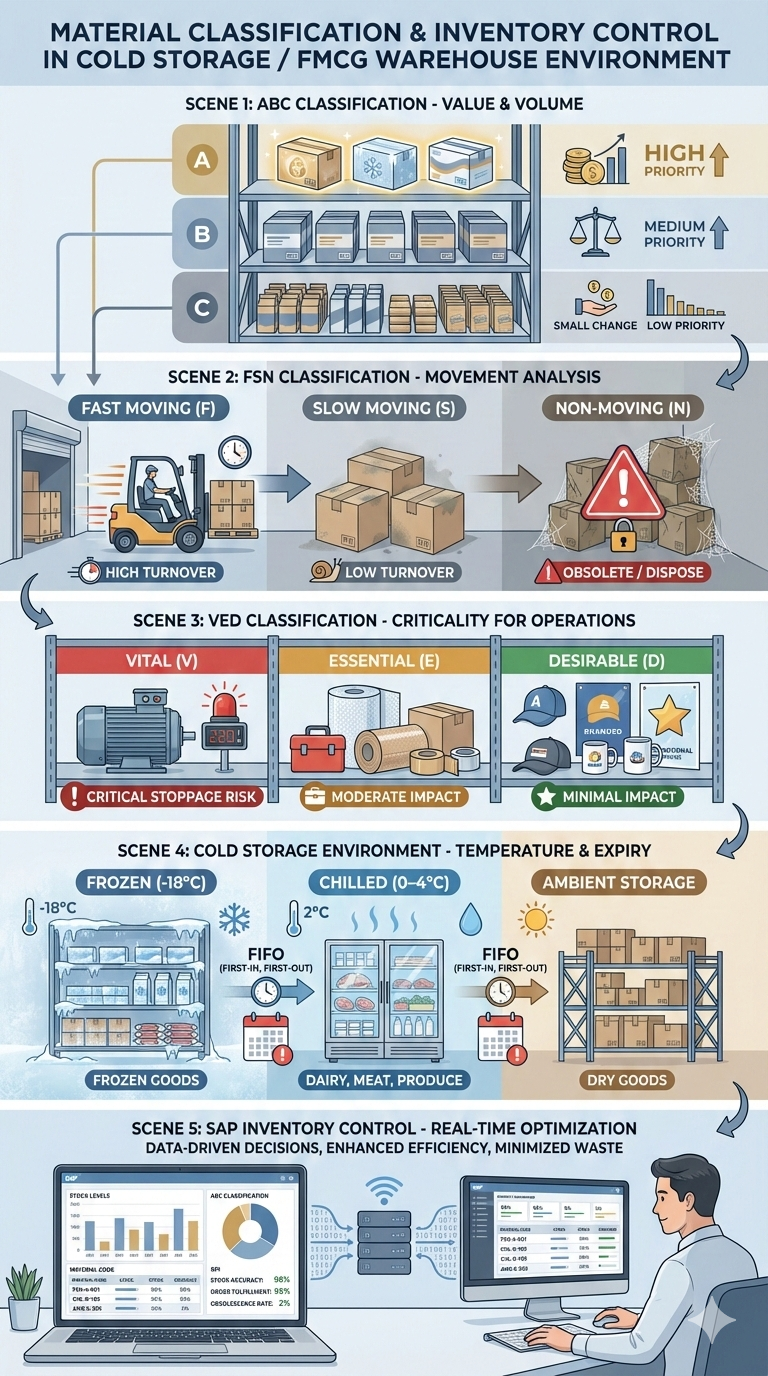Inventory is not just stock sitting in a warehouse — it is working capital invested in the business. When inventory is poorly managed, cash gets blocked, space is wasted, and operations suffer. Whether it is a manufacturing plant, cold storage, or distribution center, effective inventory control begins with one core discipline: material classification.